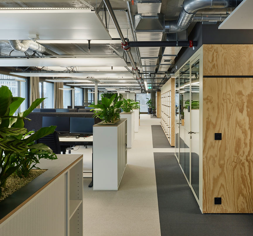Die beiden Geschosse im Hochhaus wurden als sogenannter Mieterausbau zu Büroräumlichkeiten ausgebaut. Grundlage war das Gestaltungskonzept der SBB unter Einbezug des Farbkonzepts des Büros für Innenarchitektur Dost. Die Räume sollen unterschiedliche und gemütliche Arbeitsplatzsituationen schaffen, welche die Kommunikation fördern. Aus Gründen der Nachhaltigkeit wurden ausser den Arbeitspulten und den Stühlen fast ausschliesslich bestehende Möbel der SBB wiederverwendet. Damit dies als qualitätsvolles und stimmungsvolles Gesamtkonzept erkennbar ist, wurden die funktionellen Schliessfächer in eine ordnende Raumhülle aus Sichtsperrholz eingepasst. Die Verglasungen und die Holzkonstruktion bilden ein durchgehendes und ordnendes Ganzes rund um die Sitzungszimmer.